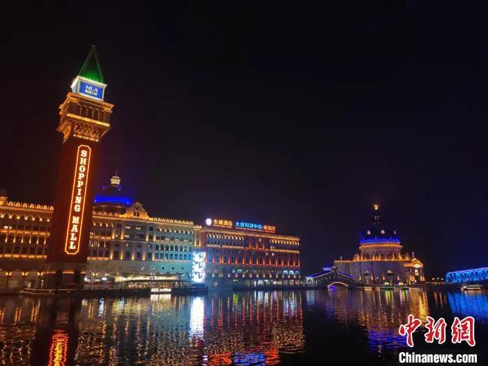 【海澜飞马水城夜景,美感十足。 孙权 摄】