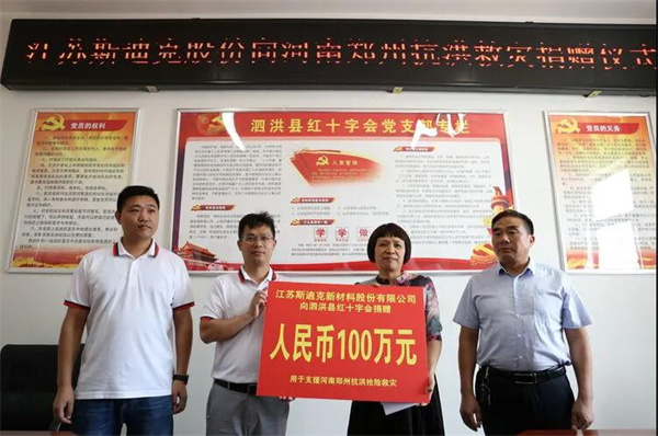 在捐赠仪式上,倪建国代表江苏斯迪克新材料股份有限公司现场向县红十字会捐赠100万元,用于支援灾区开展救灾救援工作,解决受灾地区群众的燃眉之急。