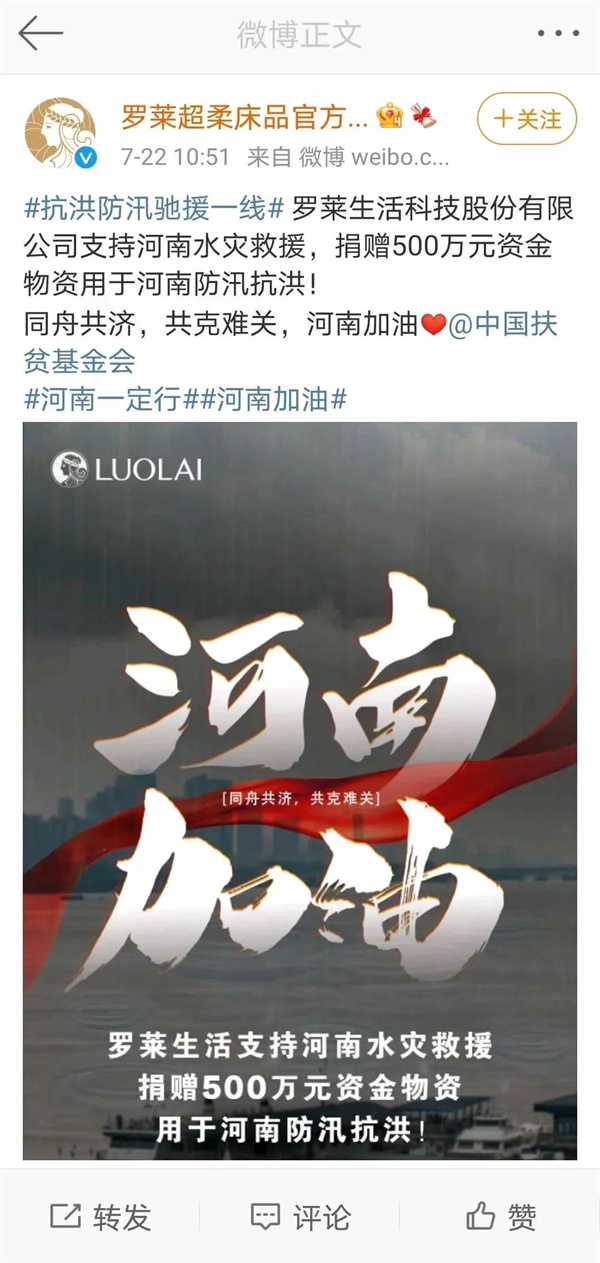 7月21日,罗莱生活科技股份有限公司支持河南防汛抗洪,向中国扶贫基金会捐赠500万元物资用于河南水灾救援。