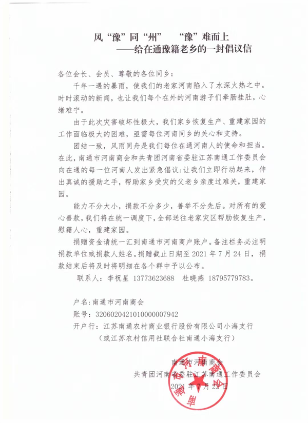 7月22日,南通市河南商会发出《风“豫”同“州”“豫”难而上——给在通豫籍老乡的一封倡议信》,共同帮助家乡受灾的父老乡亲度过难关,重建家园。