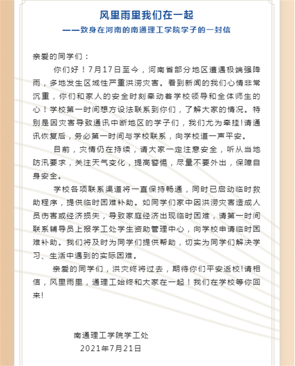 7月21日,南通理工学院发出《风里雨里我们在一起——致身在河南的南通理工学院学子的一封信》,为家中因洪涝灾害造成人员伤害或经济损失的同学提供临时困难补助。
