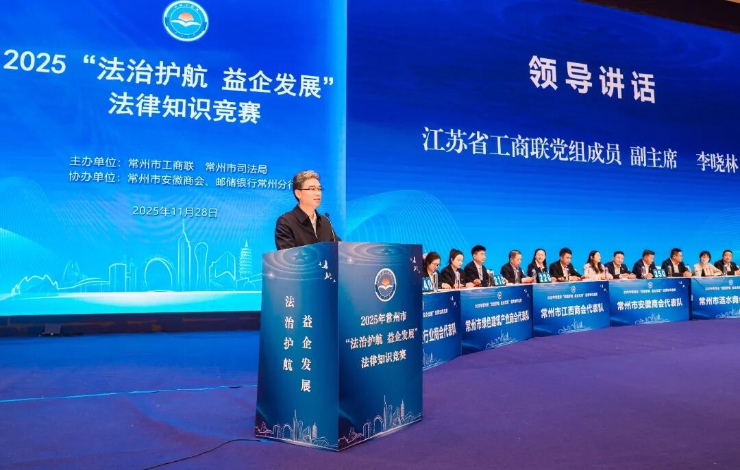 在全国第十二个国家宪法日即将来临之际,11月28日下午,一场聚焦民营经济法治建设、助力企业完善现代治理的盛会——2025年“法治护航 益企发展”法律知识竞赛在常州火热举行。此次活动由常州市工商联、司法局联合主办,市检察院、公安局、律师协会等相关部门共同参与。省工商联党组成员、副主席李晓林出席活动,来自市各直属商会的250余名代表齐聚一堂,共赴这场法治与发展的知识盛宴。